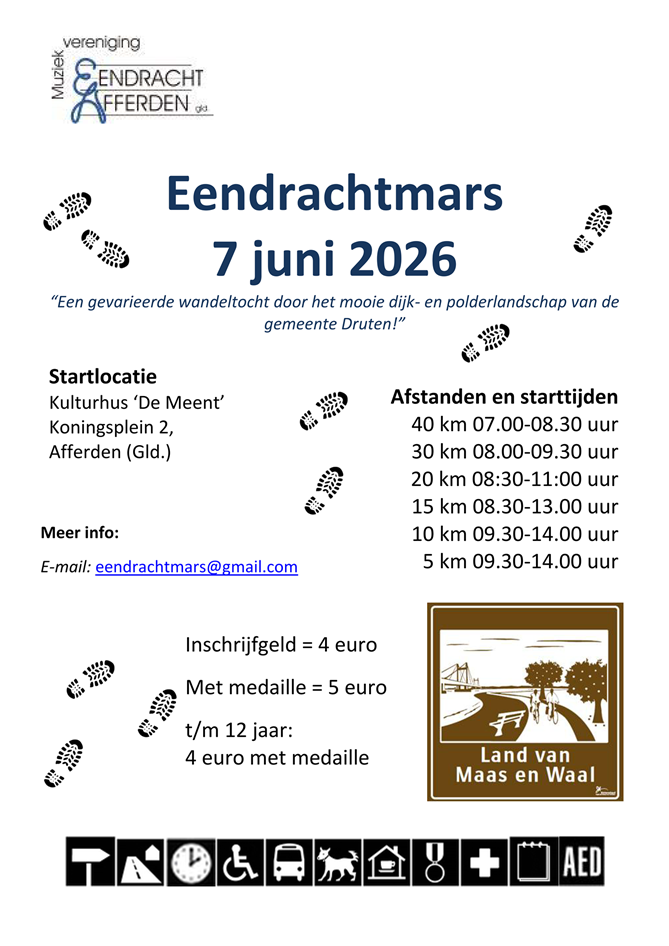 Elk jaar orgsaniseert Muziekvereniging Eendracht op de eerste zondag van juni de Eendrachtmars. Een mooie mars ter voorbereiding op o.a. de Nijmeegse vierdaagse door het mooie land van Maas en Waal. Er is keuze uit diverse afstanden en tijdens de route zijn er diverse mogelijkheden om even een pauze te nemen.